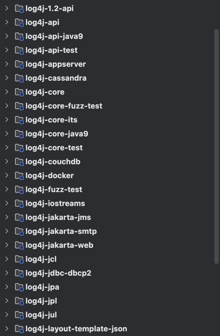 Log4j 프로젝트는 수많은 모듈로 이루어진 멀티 모듈 구조를 이루고 있습니다.